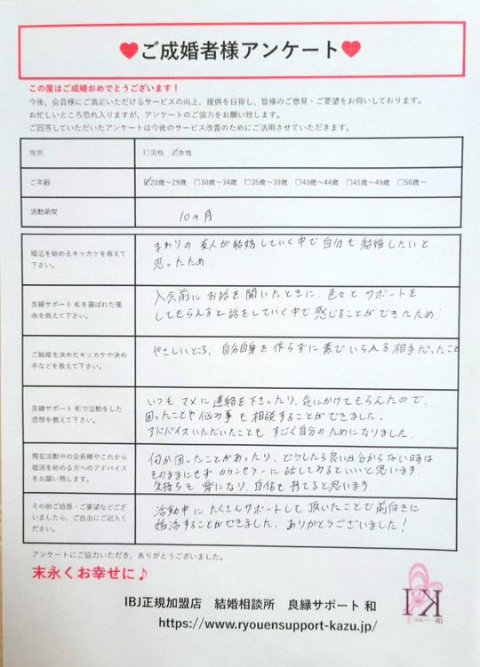 活動中にたくさんサポートをして頂いたことで前向きに婚活をすることができました。