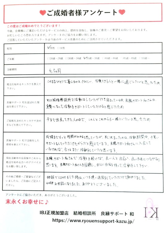 成婚までもっと時間がかかると思っていたが、早く決まったのは、活動期間中、手厚いサポートをして頂けたからだと思っています。