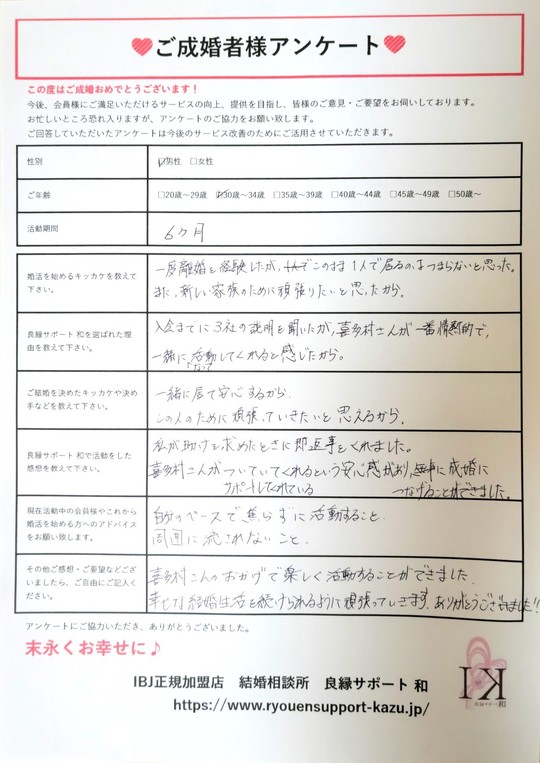 喜多村さんがついていてくれる、サポートしてくれているという安心感があり、無事に成婚につなげることができました。