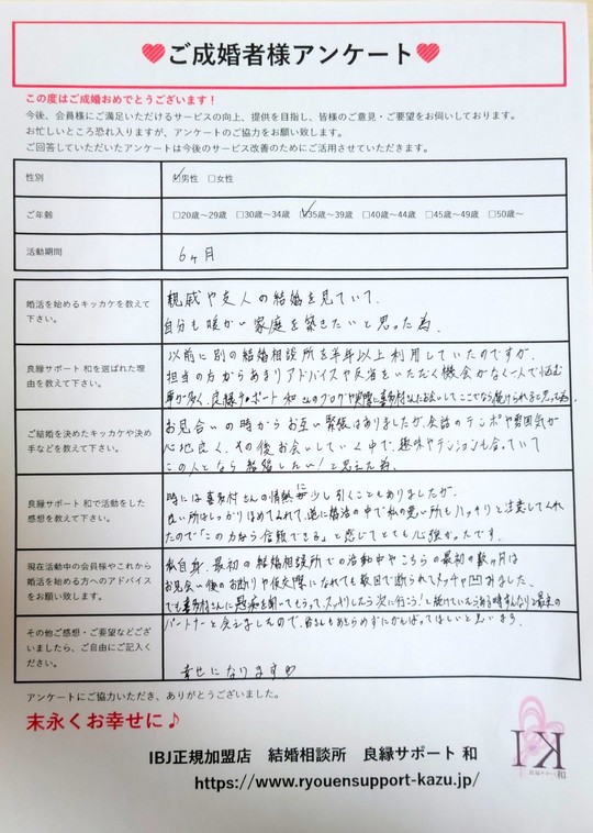 以前も別の結婚相談所を半年以上、利用していたのですが、担当の方からあまりアドバイスや反省をいただく機会がなく、一人で悩むことが多く、良縁サポート 和さんのブログや実際に喜多村さんにお会いして、ここでなら続けられると思ったため。