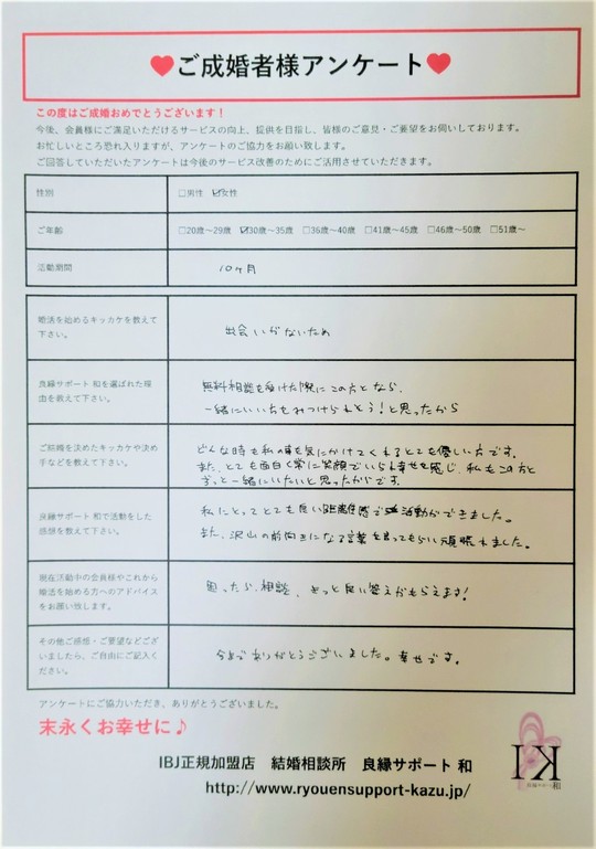 無料相談を受けた際に、この方となら一緒に良い方を見付けられそう!と思ったから。