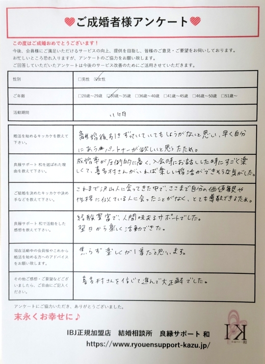成婚率が圧倒的に高く、入会時にお話した時にすごく楽しくて、喜多村さんがいれば、楽しい婚活ができそうな気がした。