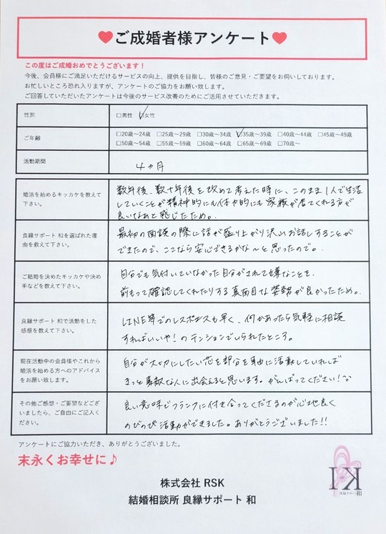 ・数年後、数十年後を改めて考えた時に、このまま1人で生活していくことが精神的にも体力的にも家族が居てくれる方がいいなぁと感じたため。