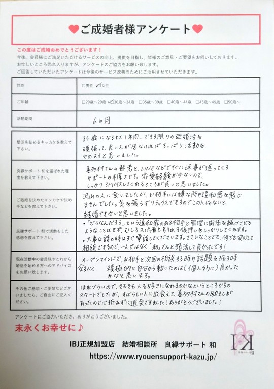 些細なことでも何でも安心して相談できるので、一人ではなく「和」さんと婚活して良かったです!