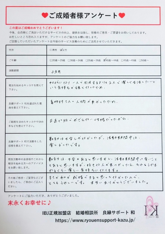 まさか私が成婚できると思ってなかったので、とても嬉しいです。