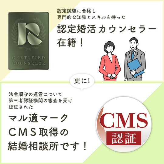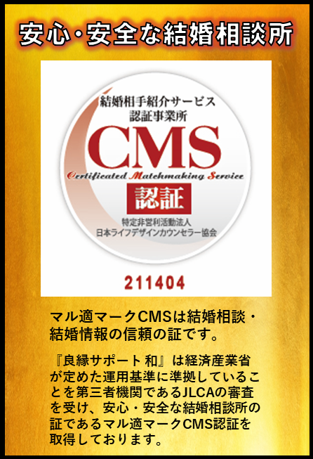 法令遵守の安心安全な結婚相談所の証である『マル適マーク(CMS)』も取得しています。