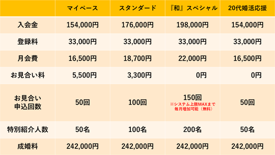 システム利用費・情報管理費、お相手ご紹介・カウンセリング等の各サポートに掛かる費用です。
