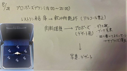 この日の為に彼も『プロポーズリング』や『レストランの予約』など準備を進めていきました。