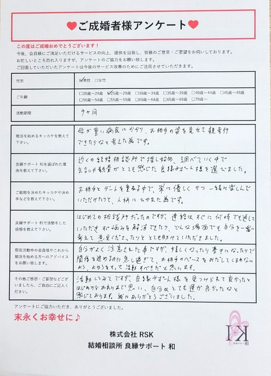 ・活動してみてですが、良縁サポート 和 様を見付けられて良かったと始めから終わりまで思い、自分はとても運が良かったなと感じでおります。