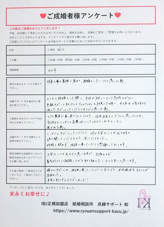 もともと結婚をした際に子どもが欲しいという気持ちがなく、良縁サポート 和さんのYouTubeを拝見した時に、その点の気持ちを汲んでサポートしてくださりそうだと思った為。