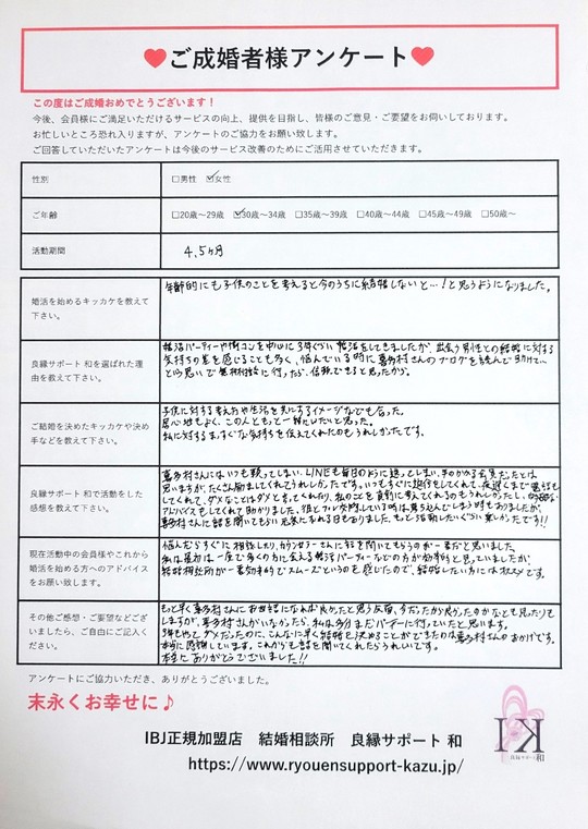 婚活パーティーや街コンを中心に3年ぐらい婚活をしてきましたが、出会う男性との結婚に対する気持ちの差を感じることも多く、悩んでいる時に喜多村さんのブログを読んで、助けて…という思いで無料相談に行ったら信頼できると思ったから。